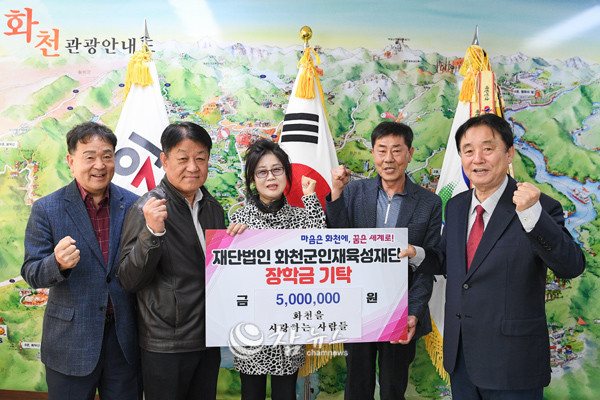 【화천=참뉴스】정광섭 기자 = ‘화천을 사랑하는 사람들’(회장:곽경배) 회원들은 2일 화천군청을 방문해 장학금 500만원을 최문순 화천군 인재육성재단 이사장에게 기탁했다. (사진=화천군청 제공)